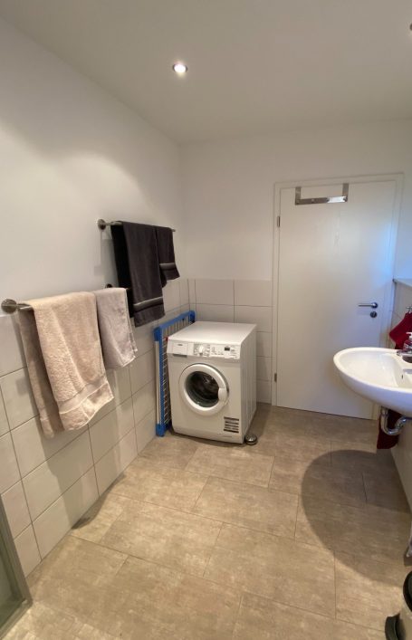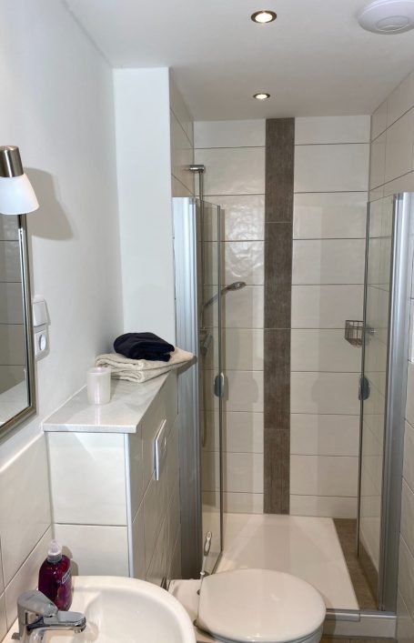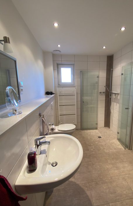 Es stehen Ihnen zwei Bäder zur Verfügung. Im großen Bad finden Sie eine bodengleiche Dusche mit wegklappbaren Türen, so dass Sie die Dusche auch mit einem Rollstuhl befahren können.